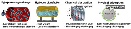 Figure 2 shows the feasible techniques for hydrogen storage, which are classified into four types: high-pressure gas storage, hydrogen liquefaction, chemical absorption, and physical adsorption [13,14,15]. Currently, a method involving physically compressed storage with high-pressure tanks is the only commercialized hydrogen storage technique for mobile systems. The four types of compressed tanks are classified by their cylinder’s materials: Type I comprises entirely metal, Type II comprises metal liner with hoop wrapping, Type III comprises metal liner with full composite wrapping, and Type IV comprises plastic liner with full composite wrapping [16,17]. Both steel and aluminum are used in conventional high-pressure hydrogen storage tanks; however, they are not sufficiently strong. Recently, the development of vessels made of composites, including carbon fiber and epoxy with high mechanical strength, is in progress [18,19,20,21]. However, the high cost and maintenance of high-pressure cylinders have been an impediment to expanding hydrogen fuel cell-based technology. This method requires a considerable amount of energy, and there is a risk of leaking hydrogen at the high pressure of 700 bar. Moreover, compressed hydrogen does not achieve the target value set by the US DOE in 2020 for a gravimetric density of 0.045 kg H2/kg system; the compressed method reached 0.042 kg H2/kg system at a pressure of 700 bar [22,23,24]. In the case of liquefied hydrogen, a large amount of hydrogen is stored in a confined volume compared to high-pressure compression-based storage [25,26]. Cryogenic hydrogen storage at 20 K requires a cooling system and additional energy compared to the high-pressure storage method [27,28,29]. This storage method has a remarkably high storage density compared to other methods. However, the energy cost required for liquefaction is high, and there are hydrogen gas losses because it vaporizes at room temperature. Moreover, it requires double-walled cylinders with good thermal insulation systems. A chemisorption technique is used for storing hydrogen gas as a form of metal hydrides in a solid-state [30,31,32]. This technique has been spotlighted due to its high storage density, remarkable stability, and small space occupancy [33,34,35,36]. A number of metal hydride vessels have been developed [37,38,39]. NaAlH4, LiAlH4, LiBH4, NaBH4, and AlH3 are used as metal hydrogen storage materials; in particular, Mg2NiH4 is in the limelight because of its advantages, such as its high storage capacity, low cost, and light weight [40]. However, the disadvantage is that high temperatures are required for desorption because of the lack of reversibility of hydrogen adsorption–desorption due to its strong bonding force and slow kinetics [41]. Physisorption storage is a process by which hydrogen molecules are weakly adsorbed at the material’s surface via London dispersive forces [42,43,44,45]. Physisorption technology is the most competitive in price since it stores hydrogen molecules at room temperature and at relatively low pressures. In general, materials used for physical adsorption are porous because they require a large specific surface area. This strategy’s advantages are its light weight, high storage density, superior reversibility and cycle stability, and fast charging–discharging speed. Compared to liquid storage at cryogenic temperatures, physisorption reduces hydrogen boil-off loss during storage and consumes relatively low amounts of energy during charging and discharging [23,46]. Porous materials such as zeolites, metal–organic frameworks (MOFs), covalent organic frameworks (COFs), and carbon materials (fullerenes, nanotubes, and graphene) are the most extensively examined materials [47].