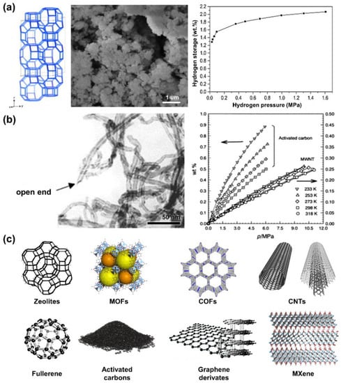 (a) Three-dimensional structural information, SEM image, and hydrogen uptake on 77 K and 16 bar of LEV-type zeolite for hydrogen adsorption, (b) TEM image and hydrogen storage uptakes on various temperatures (233–318 K) and 110 bar, and (c) various candidates for hydrogen adsorbents. Reproduced from ref. [60]; copyright (2007) with permission from Elsevier. Reproduced from ref. [61]; copyright (2004) with permission from Nature Research.