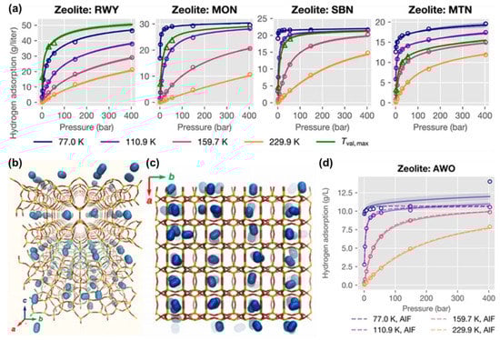 (a) Hydrogen adsorption behaviors of various types of zeolites, (b,c) 3D illustrations for hydrogen adsorbed in AWO-type zeolite, and (d) hydrogen adsorption isotherms of AWO-zeolite. Reproduced from ref. [47]; copyright (2021) with permission from AAAS.