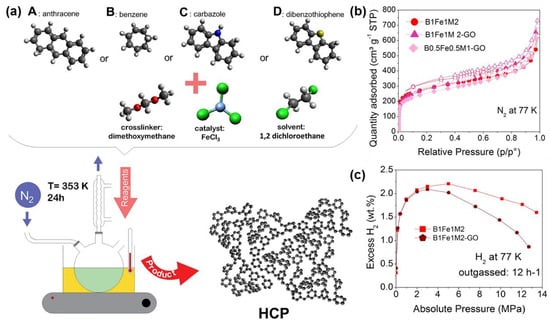 (a) Schematic illustration of the preparation process for hyper-crosslinked polymers (HCPs); the monomers used were (A) anthracene, (B) benzene, (C) carbazole, and (D) dibenzothiophene. (b) Adsorption–desorption isotherms for N2 at 77 K. (c) Hydrogen adsorption curves at 77 K and 14 MPa for COF (B1Fe1M2) and COF-GO composites (B1Fe1M2-GO) after the first 12 h of outgassing. Reproduced from ref. [82]; copyright (2022) with permission from Elsevier.