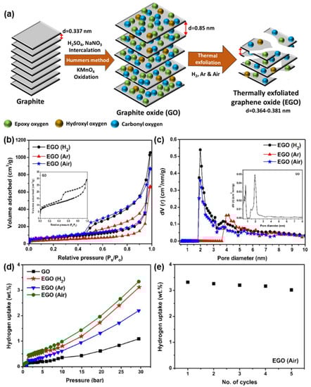 Graphene derivatives such as graphene oxide (GO) and reduced graphene oxide (rGO) are other promising materials for the hydrogen storage system [125,126,127]. Functional groups such as hydroxyls, carbonyls, and carboxyls trap hydrogen molecules via hydrogen bonds that are stronger than the London dispersive force [128]. Moreover, oxygen-containing functional groups not only form gaps between graphene layers but also creates suitable conditions for loading metal nanoparticles in order to create higher hydrogen capacities [10,129]. Graphitic carbons, which are sp2 hybridized and have a sheet-like structure, interact using van der Waals forces. Singh et al. synthesized exfoliated graphite oxide (EGO) with a thermal exfoliation method under various gas conditions [130]. Air-exfoliated EGO represents a specific surface area of 268 m2 g−1, average pore size of 2.9 nm, and total pore volumes of 1.2 cm3 g. The maximum hydrogen uptake of EGOs was 3.34 wt% at 77K and 30 bar. After five cycles, the hydrogen’s capacity decreased by only 9%, indicating a storage amount of 3.02 wt% (Figure 9).