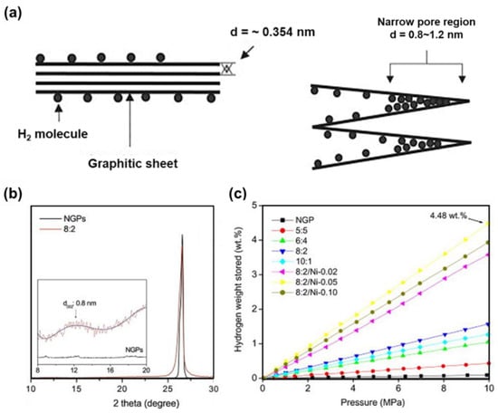 Porous graphite hybridized with nickel (Ni/PG) has been reported as a potential hydrogen storage material [131,132]. Ni/PG provides a specific surface area of 145 m2/g and a total pore volume of 0.056 cm3/g. The optimized samples achieved 4.48 wt% of hydrogen uptake at 298 K and 100 bar (Figure 10).