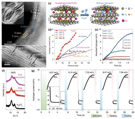 - Liu, S.Y.; Liu, J.Y.; Liu, X.F.; Shang, J.X.; Xu, L.; Yu, R.H.; Shui, J.L. Hydrogen storage in incompletely etched multilayer Ti2CTx at room temperature. Nat. Nanotechnol. 2021, 16, 331–336. [Google Scholar] [CrossRef]