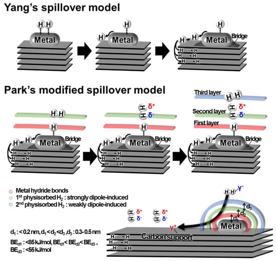 In recently reported studies [131,156], a modified spillover model was proposed to redeem the gap between the real improvement of hydrogen capacities and expected hydrogen spillover effects. The hydrogen molecules adjacent to the adsorbents are classified via three layers in this model (Figure 12). The hydrogen molecules of the first layer dissociatively adsorbed on the metal surfaces via the Kubas interaction from the high oxidative power of the metal [157]. The second layer of hydrogen, physically adsorbed on an adsorbent, was partially dipole-induced because of the strong electron–acceptor characteristics of the metal. The other hydrogen molecules were close to the physically adsorbed adsorbent; however, the equilibrium of the third layer was broken by the attraction of partially acidic carbon surfaces. The carbon surface surrounding the metal lost its electrons (electron acceptor properties) because of the strong electron–acceptor characteristics of the metallic catalysts [158,159]. This environment acts as a driving force for hydrogen affinity properties on carbon surfaces via electron–acceptor–donor interaction behaviors.