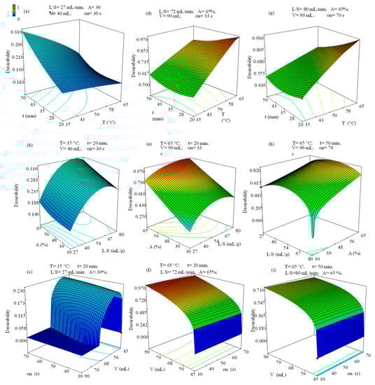 By means of Equations (15)–(17) it was possible to build the desirability function in order to investigate the combined effects of all the operating conditions investigated. The response variables were maximized by assigning the highest importance to (5/5) to LY, followed by ARP (4/5) and TC (3/5), while the values of the input variables where the best solution was found were in the same range of the experimental session, with exception given for the total volume. Indeed, process optimization was also imposed to maximize this variable (importance 3/5) in order to understand the maximum volume treatable with the same energy input without significant losses in extraction yields. The desirability function dependence on input variables is reported in Figure 2. Surface plots on the same row (e.g., Figure 2a,d,g) show the same input variables on the axes, while the columns report the minimum (Figure 2a–c), optimal (Figure 2d–f,) and maximum (Figure 2g–i) values of the operating conditions in the selected design space. The strong interdependence of the operating conditions was revealed by the shape changes of the surface in correspondence with the minimum (Figure 2a–c,) and maximum (Figure 2g–i) values of the variables. Extraction time is one of the most important variables in this kind of separation process, and the higher the contact time between the solid particles and the solvent, the higher the mass transfer achieved. Nevertheless, extraction kinetics often show a plateau, and times longer than the critical value do not provide a significant enhancement in extraction yields. Furthermore, when thermo-sensitive compounds are involved in the process, degradation kinetics should be taken into account. Conflicting effects of extraction times were reported by several authors. For instance, positive effects of prolonged time in UAE were found for the recovery of polyphenols and phlorotannin from brown seeds [42] and lycopene from tomato [7,35], as well as for flavonoids from Lycium barbarum up to 90 min [43], while a reduced concentration of polyphenols from mango residues was observed by prolonging the time from 20 to 30 min [44], of anthocyanins from pigmented rice after 20 min [45], and a slight decrease in lycopene yield from tomato was also observed in improved ultrasound-assisted extraction after 20 min of sonication [46].