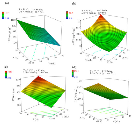 Surface plots of: (a) total carotenoid yield (TC); (b) antiradical power (ARP); and (c,d) lycopene yield as functions of amplitude (A) and total volume (V).