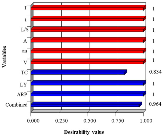 In Equation (9), ri represents the importance that can be assigned by the user (in the software from 1 to 5) for each response variable [26]. The definition of di used in this study, where the purpose is the maximization of the response variables, is given by Equation (8), where Yi is the response variable, and Yi,min and Yi,max are the lower and upper value of Yi [27].