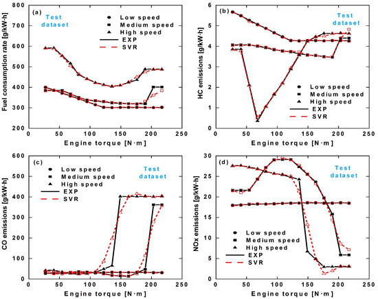 To further evaluate the success of the training model, steady-state datasets were utilized. As shown in Figure 3, 45 of 135 groups were selected, testing the prediction ability of the SVR model for engine performance under different engine loads with certain speeds (i.e., 1820, 2965, and 4505 RPM). Moreover, 27 of 135 groups were used to evaluate whether the engine speed effect on engine performance can be predicted by the prediction model under certain loads (i.e., 54, 108, and 188 N·m).