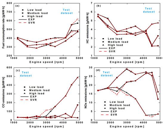 Figure 10 shows the impact of engine speed on fuel consumption and emissions under 54, 108, and 188 N·m engine loads, respectively. Figure 10a shows the prediction of fuel consumption rate, which is more sensitive to engine speed. Figure 10b presents the prediction of HC emissions, which decreased and then increased as the speed increased. In the most economical operating condition, it is less generated, which indicates high combustion efficiency. At higher speeds, the combustion efficiency of the engine decreased, and the amount of HC emissions increased, which was evident at high load, because of more fuel injected in the cylinder. Figure 10c shows the CO emission prediction, under high load conditions, due to less reaction time, more fuel injection volume, and uneven air–fuel mixture, the combustion was not sufficient and incomplete, which made the CO increase significantly. Figure 10d shows the NOx emissions prediction, at high speed; the NOx emissions generation was less due to insufficient combustion resulting in low in-cylinder temperature. As for the evaluation of the ML method prediction precisions, the SVR model captured the variation trend in these parameters under different speeds and could predict engine performance under different operating with small errors.