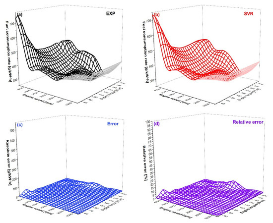 Comparison of SVR-predicted and experimental fuel-consumption-rate-established engine map. (a) The experimental data; (b) The SVR-predicted data; (c) The absolute error; (d) The relative error.