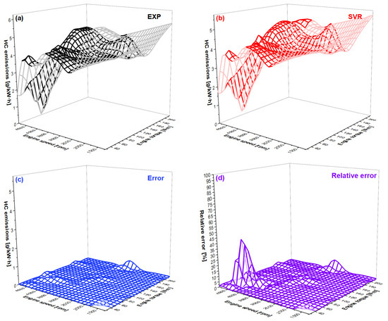 Comparison of SVR-predicted and experimental HC-emissions-established engine map. (a) The experimental data; (b) The SVR-predicted data; (c) The absolute error; (d) The relative error.