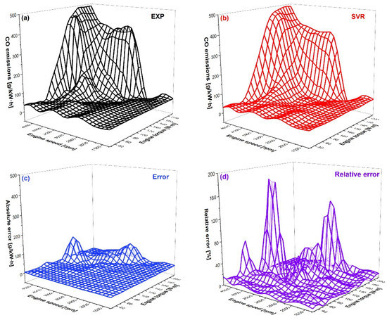 Comparison of SVR-predicted and experimental CO-emissions-established engine map. (a) The experimental data; (b) The SVR-predicted data; (c) The absolute error; (d) The relative error.