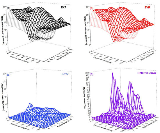 Comparison of SVR-predicted and experimental NOx-emissions-established engine map. (a) The experimental data; (b) The SVR-predicted data; (c) The absolute error; (d) The relative error.