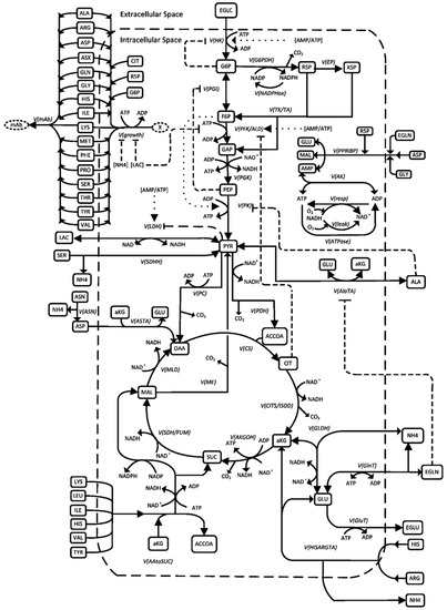 The mathematical description of intracellular metabolism was adapted from a published dynamic metabolic model [