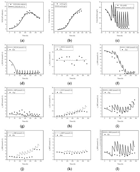 From the progression of, e.g., Gln (d) and ASN (f), it can be seen that these amino acids are consumed faster in cultivation than they are supplied by feeding. Furthermore, from the progression of GLY concentration (h), a slight overfeeding of this component can be predicted by the model.