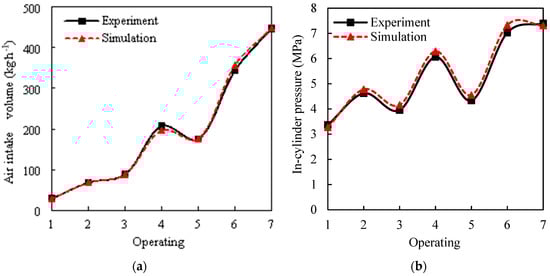 Comparison of the experimental and simulation values under different operating conditions: (a) determined air intake volume, (b) in-cylinder pressure values.