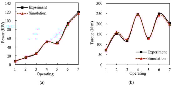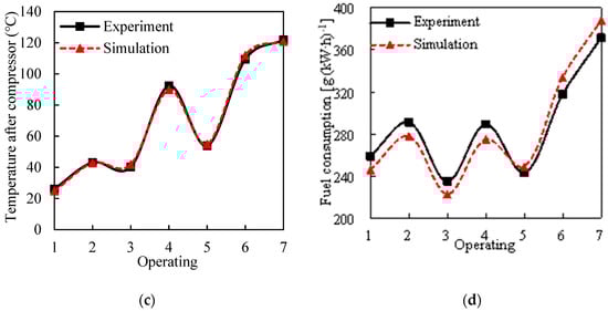 Comparison of the experimental and simulation values under different operating conditions: (a) power, (b)torque, (c) temperature after compressor, (d) Fuel consumption.