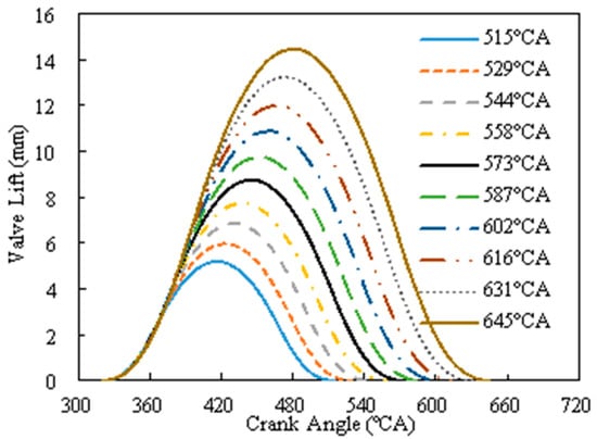 In this study, the difference between the actual IVC and the original IVC moment was defined as the Miller intensity. When the Miller intensity was 0 °CA, it represented the original engine. Table 3 shows the nine Miller cycle schemes that were designed in this study. A negative Miller intensity represented EIVC, while a positive Miller intensity represented LIVC. As shown in Figure 4, ten groups of the curve of the valve lift were designed, including the original engine. The design curve of valve lift was used as the input value, and the throttle opening was adjusted to ensure that the air intake volume was the same, that is, that the load remained the same. The change of the engine economy under different Miller strengths was studied.