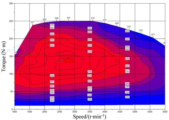 The fuel consumption chart for the universal characteristic of the engine studied is shown in Figure 5. Based on the analysis above and the common operating conditions of the engine, two sets of operating conditions were finally selected as the research objects. The first group was a 50% load condition with common speed from 1000 to 3600 r/min, implemented to study the improvement of pumping loss and fuel economy optimization by the Miller cycle. The second group was the common to full load operating conditions and the engine calibration operating conditions from 1000 to 5600 r/min. It was used to study the improvement of thermal efficiency of the Miller cycle and the demand of the turbocharger under full load operating conditions.