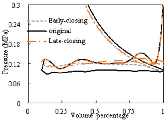 The comparison of low pressure P-V diagrams for three Miller cycle schemes under 50% load condition are shown in Figure 9. Because the throttle was not fully open, a certain vacuum degree was generated during the intake process of the piston downward, and a large loss of power was generated at that time. As a result of the increased throttle opening in the EIVC Miller cycle, the intake pressure was higher at that time than it was in the original engine until the valve closed. With the downward movement of the piston producing a larger volume in-cylinder, the P-V diagram went through the process of pressure drop and rise. If the loss caused by heat transfer was not considered, this part of the pumping work changed was not significant. For the LIVC Miller cycle, also as a result of the increased throttle opening, the intake pressure at the early stage of intake was equivalent to EIVC, and both were higher than the original engine. However, as the piston moved down, the intake valve lift of the EIVC Miller cycle reached the maximum and the valve started to seat, while the intake valve of the LIVC Miller cycle still had a larger lift at that time. However, in the late intake valve closing scheme, after the valve was closed, the in-cylinder pressure curve in the compression process basically overlapped with the curve in the EIVC scheme. Considering that the three exhaust pressure curves basically overlap, the pumping loss was also mainly reflected in the change of the intake loss work.