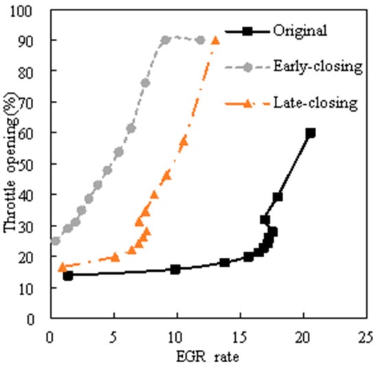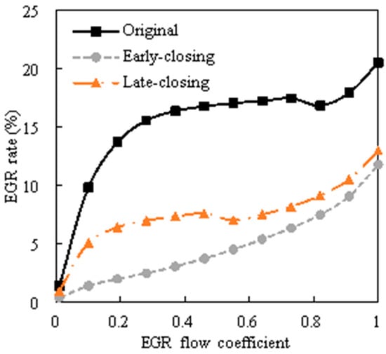 Figure 14 shows the change of the EGR rate with the EGR valve flow coefficient (from 0.01 to 1) of the original machine, as well as the EIVC (515 °CA) and the LIVC (631 °CA) of the Miller cycle at a speed of 2000 r/min and 50% load. The EGR rate of the original machine was up to 21%, while the EIVC and LIVC were 12% and 13%, respectively. Because of partial loading of the original engine, the throttle opening was small and a certain negative pressure formed at the EGR outlet. After the Miller cycle was adopted, the throttle opening increased and the pressure at the EGR outlet increased, which caused the EGR flow resistance to increase. As a result, the EGR rate in the Miller cycle’s LIVC was reduced, and the EGR rate in the Miller cycle’s EIVC was the lowest. This was due to the fact that the EIVC of the Miller cycle had a lower charging efficiency than the LIVC of the Miller cycle under specific Miller intensities. As a result, the throttle opening of the Miller cycle’s EIVC rose, the intake pressure increased, and the exhaust gas recirculation capacity reduced for the same intake flow rate.