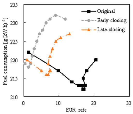 Figure 15 shows the influence of the EGR rate on fuel consumption rate for the original machine and the Miller cycle schemes of the EIVC and LIVC. The figure shows that the EGR rate was within 17%. The engine’s fuel consumption could be continuously improved as the EGR rate increased. Furthermore, fuel consumption dropped by about 4.5 percent. When the EGR rate rose above 17%, as the EGR rate increased, the fuel economy deteriorated. This change was reflected in the EIVC and LIVC Miller cycles. For the LIVC Miller cycle, when the EGR rate was about 7%, the fuel consumption rate was the lowest, which was about 1.3% lower than the original engine at the same EGR rate, and about 3.2% lower than that of the original engine without EGR. When the EGR rate was higher than 3%; however, the EIVC Miller cycle’s fuel consumption deteriorated significantly.