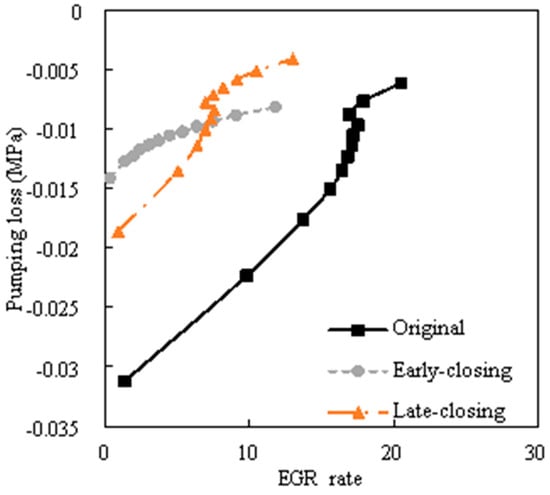 When the EGR system was applied to the engine, exhaust gas occupied part of the fresh air. To maintain the same dynamic characteristics as the original engine, it was necessary to increase the throttle opening and reduce the pumping loss. As shown in Figure 16 and Figure 17, the EIVC and LIVC Miller cycle both increased with the EGR rate, gradually increasing the throttle opening, and gradually reducing the pumping loss, especially for the original engine. When the throttle opening was small, this improvement was more significant for the Miller cycle. When the throttle opening was large, the pumping loss was lower than that of the original engine.