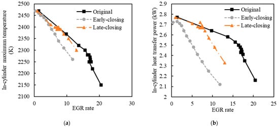 The temperature and pressure in the combustion chamber were lower than in the original engine throughout the combustion process because the in-cylinder pressure and temperature were low at the initial moment of compression. The highest in-cylinder temperature was reduced by more than 10 K for both the EIVC and LIVC Miller cycles, as shown in Figure 10, for a comparison of the highest in-cylinder temperature at different intake valve closing times. Because of the decreased heat transfer, as illustrated in Figure 11, the Miller cycle was used after the cylinder heat transfer was reduced, resulting in an increase in useful work.