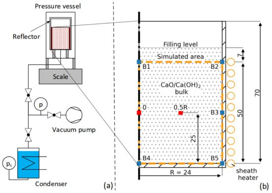 Lab-scale experiments were performed in an indirectly heated cylindrical fixed bed reactor with a height of 70 mm and an inner diameter of 48 mm, as depicted in Figure 1a. Details of the reactor are described by Funayama et al. [34,35]. The reactor is placed in a reaction chamber to allow for pressure variations. A 500 W sheath heater heats the reactor and a scale measures the weight changes of the reaction chamber caused by the chemical reaction. The reaction chamber is connected to a vacuum pump and a water reservoir. The temperature of the water is controlled to adjust the steam pressure in the system via condensation or evaporation. All connecting pipes are heated to avoid condensation. An amount of 78.98 g Ca(OH)2 with a purity of 99.9% was filled inside the reactor, resulting in a bulk height of 57 mm. Inside the reactor, there are 7 thermocouples, as displayed in Figure 1b, and additionally, there are 2 pressure probes at the vacuum pump (p) and the water reservoir (pc). The theoretical conversion is calculated as the quotient of the time-dependent, measured mass difference to the theoretical mass difference: . The maximum theoretical mass change for the used Ca(OH)2 mass is 19.2 g. Additionally, a normalized conversion () is calculated to compare the experiments to the simulation if full conversion is not reached in the experiments.