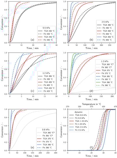 Figure 2 displays the results of the isothermal and dynamic TGA experiments (solid lines). The reaction rate increases with higher temperatures and lower pressures, but the time scales vary significantly in the analyzed range. For high temperatures and low pressures (i.e., a large distance to the thermodynamic equilibrium), full conversion can be reached within 5 min (420 °C at 1.2 kPa, Figure 2c), while for a lower distance to the thermodynamic equilibrium, a conversion below 15% is reached after 200 min (365 °C at 1.2 kPa, Figure 2d). Moreover, there is a narrow temperature zone in a range of 40–50 K above the thermodynamic equilibrium temperature where the transition between a comparatively slow and fast conversion takes place. The decrease of 10 K from 375 to 365 °C increases the time for reaching the same conversion by the factor of 6 and 13 for a pressure of 1.2 and 0.8 kPa, respectively (Figure 2d,e). Furthermore, also a pressure change can have a strong impact on the reaction rate: if the pressure is increased at 390 °C from 0.8 to 1.2 kPa (factor 1.47), the time for reaching full conversion is increased by 1.6 times, but if the pressure is approximately tripled to 2.5 kPa, the time until full conversion is reached increases by a factor of 19 (Figure 2e,d,b).