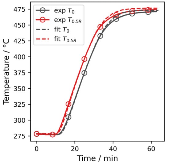 Qualitatively, the simulated temperatures (dashed lines in Figure 6a) show a similar behavior compared to the measurements. However, there is another local minimum after 5 and 7 min for T0 and T0.5R, respectively, which does not occur in the experiment. Thereafter, both temperatures decrease again, reach a global minimum, and increase again. Although the temperature levels of the global minimum (390 °C for T0 and 394 °C for T0.5R) are close to the measurements, the minimum is shifted toward higher times (i.e., 100 and 70 min for T0 and T0.5R, respectively).