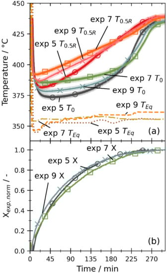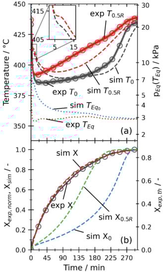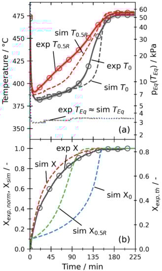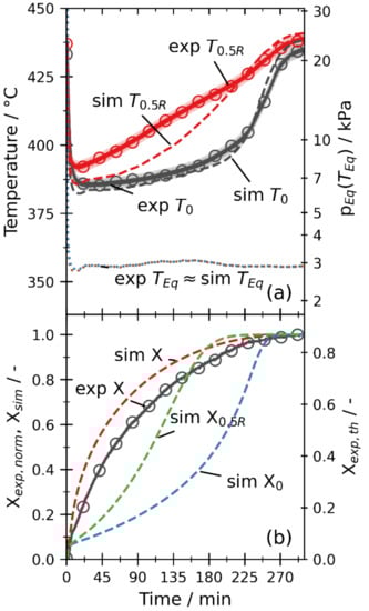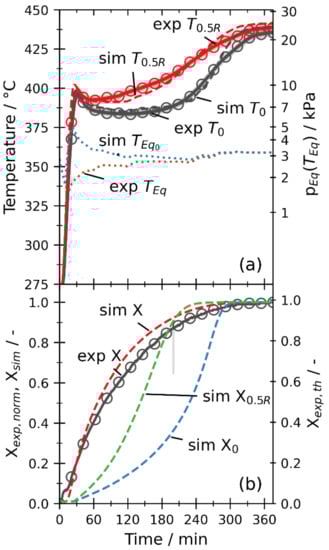 A dehydration reaction initiated by a temperature increase (T+) from an initial temperature of 270 °C is depicted in Figure 4. Both T0 and T0.5R (black and red solid line with markers in Figure 4a) increase until a local maximum is reached after 30 min. Then, T0.5R decreases to a short plateau at 390 °C and minute 50, which is held for about 30 min and finally increases again up to a temperature of 440 °C. For T0, the plateau is at a lower temperature of 385 °C, and with a duration of about 120 min, it is more pronounced. The following temperature increase is steeper, covering 150 K in 150 min. The equilibrium temperature from the measured steam pressure ‘exp TEq’ (orange dotted line) shows a slowly increasing course with a mean temperature of 353 °C, which corresponds to a pressure of 2.8 kPa. The measured conversion (exp X, black solid line with markers in Figure 4b) shows a decelerating course, starting at about 14 min and reaching its maximum conversion, which also corresponds to a theoretical full conversion after 360 min.