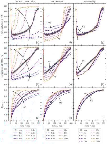 With the validated model, the sensitivity and limitations of the system are analyzed. Therefore, the effective thermal conductivity and the reaction kinetics are varied by the factors 0.1, 0.2, 0.5, 1, 2, 5, and 10. Furthermore, the permeability has been varied between factors 1 and 100, which is equivalent to a variation of the particle size.