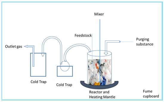 Generally, pyrolysis treatment mechanisms consist of a feeding section that handle the feedstock material. In the kettle-type reactor case shown in Figure 1 below, the feedstock is placed in the space where the mixer operates. Such feedstocks do not necessarily require pre-treatment methods, reactor unit assembly and product collection vessels that contain separation lines for the products as per their chemical properties. The mixer plays a significant role in this by ensuring primary readiness of the plastics for the actual pyrolysis process. In the work conducted by McCaffrey [36], depicted in Figure 1, the feedstock (plastic) heats up with the support of the heating mantle, thereby positioning the waste plastic feed into an enhanced readiness for the pyrolysis. The source-power is provided by an HP motor. The molten plastic is mixed with the aid of the mixer for an optimal thermal reaction. To prevent any incorporation of oxygen, the reactor is kept under a nitrogen atmosphere during the experiment. Figure 1 shows a typical pyrolysis setup but for a kettle-type reactor. The nitrogen serves as a purging substance, thus, not necessarily considered as a factor in the pyrolysis.