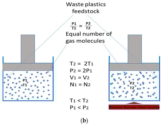 The graphical representation in Figure 2a is a theoretical display of Gay Lussac’s Law, which asserts that the pressure of a given quantum of gas at ideal conditions held at a constant mass and volume is directly proportional to the temperature involved [88]. In the context of pyrolysis, the heating of the system paves the way to increased temperatures. This engages the molecules of the waste plastic feedstock in an excited state, increasing their impacts on the reactor walls. Hence, a pressurised reaction system is established. This then gives rise to the increased motion of the gas molecules, as depicted in Figure 2b and supported by Gao and Sato and Sakata [73,85]. Figure 2b gives a schematic glance into what Gay Lussac’s Law is, with waste plastics as feedstock materials. The reaction chamber with the heat source (T2 < T1) shows an increased motion of the gas molecules of the feedstock, hitting one another, thereby giving rise to a more pressurised system, and, hence, a gaseous yield.