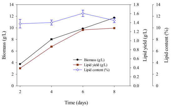 - Kong, W.; Song, H.; Cao, Y.; Yang, H.; Hua, S.; Xia, C. The characteristics of biomass production, lipid accumulation and chlorophyll biosynthesis of Chlorella vulgaris under mixotrophic cultivation. Afr. J. Biotechnol. 2011, 10, 11620–11630. [Google Scholar]