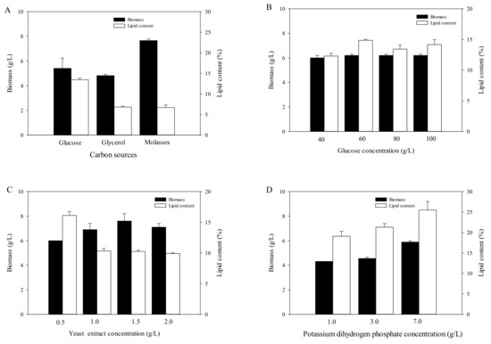 Optimization of the medium for R. mucilaginosa lipid production. Data are given as the mean SD, n = 3. (A) Impact of carbon sources on cell growth and lipid accumulation. (B) Lipid content and biomass of the yeast growth at different initial glucose concentration. (C) Lipid content and biomass of the yeast growth at different initial yeast extract concentration. (D) Lipid content and biomass of the yeast growth at different initial potassium dihydrogen phosphate concentration.