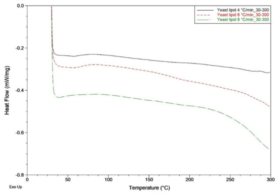 R. mucilaginosa lipids analyzed by differential scanning calorimetry (DSC) with heating rates of 4, 6, and 8 °C/min, with the temperature ranging from 30 to 300 °C.
