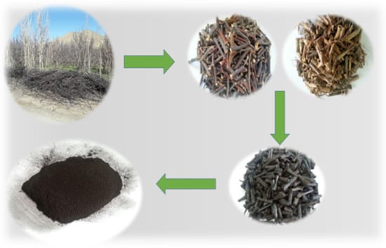 To prepare the biochar, pruning waste was collected from orchards in Urmia, West Azerbaijan Province, Iran. Then, the waste was oven-dried at 65 °C for 48 h and the dried samples were placed in a reactor (a steel cylinder with a diameter of 7 cm and height of 31 cm) and heated in an electric furnace for biochar production at 350 °C. The heating rate was 12 °C min−1 (slow pyrolysis) and the feedstocks were kept in the furnace for 2 h after reaching the final temperature. No ash was observed on the biochar surface, implying that oxygen had been removed and produced correctly. Finally, the biochar was ground and passed through a 35-mesh sieve (Figure 1). The characteristics of the biochar [38] are summarized in Table 2.