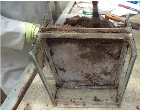 The rhizoboxes were opened after 65 days. After harvesting, the plants’ shoots were washed with tap water and then with distilled water. Thereafter, they were oven-dried at 65 °C for 48 h to determine the shoot dry weight (SDW). Following this step, the rhizoboxes were first opened from the non-rhizosphere zone and the non-rhizosphere soil was harvested. To harvest the rhizosphere soil, the plexiglass framework was removed (Figure 2). Then, the soil was removed from the rhizobox and the main and secondary roots were carefully removed from the soil. Finally, the rhizosphere soil was collected. The roots were transferred to the laboratory, where they were oven-dried at 65 °C for 48 h to determine the root dry weight (RDW). Their P content was measured using the vanadate/molybdate method (yellow method) after extraction and dry digestion. Moreover, the Fe and Zn contents were measured by the dry digestion method using an atomic absorption device (Shimadzu-AA330). The pH, electrical conductivity (EC), organic carbon content [37], P [41], and Fe and Zn [42] content of the rhizosphere soil were also determined using the previously reported methods.