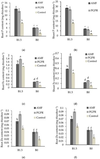 P, Fe, and Zn uptake by the plant roots and shoots were significantly affected by the combined microbial inoculation and biochar application (Figure 3). PSM significantly increased the root P content relative to the B0 and control + B0 treatments (Figure 3a). The highest root P content was observed in plants exposed to the AMF + B1.5 treatment, while the P content for this treatment was not significantly different from the PGPR inoculation alone, it was 3.24 times for the B0 + AMF treatment and differed significantly from the values obtained for all of the other treatments. A comparison of means showed that similar to the roots, microbial inoculation enhanced the P content of plant shoots when compared to the other treatments (Figure 3b). However, AMF and PGPR inoculation did not have significantly different effects on shoot P content. The highest shoot P content was observed in AMF-inoculated plants exposed to B1.5. The shoot P content for this treatment was 2.14 times greater than for the control + B0 treatment and differed significantly from the shoot P contents for the B0 treatment in both inoculated and control forms. PGPR inoculation also significantly affected the Fe and Zn contents of the plants when combined with the biochar treatment (Figure 3). The highest root (p < 0.01) and shoot (p < 0.001) Fe contents were observed in PGPR-inoculated plants treated with biochar, for which the Fe and Zn contents were 1.64 and 1.21 times higher, respectively than those for AMF-inoculated plants treated with biochar (Figure 3c,d). When biochar was not applied, AMF inoculation increased the shoot Zn (p < 0.01) content 1.2-fold. However, the Zn content in roots (p < 0.01) did not differ significantly between AMF and PGPR inoculation treatments. Moreover, the biochar application increased the root and shoot Zn content of PGPR-inoculated plants by factors of 2.25 and 3 when compared to plants not treated with biochar (Figure 3e,f).