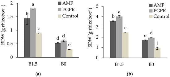 The effect of the organic source and microbial inoculation on RDW (a) and SDW (b). B1.5 and B0 are biochar 1.5% and no biochar, respectively. Different letters indicate significantly different values at p ≤ 0.05.
