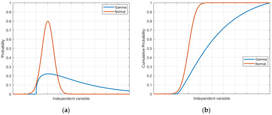 Disturbance probability can be described both by discrete and continuous PDFs based on data collection and measurements related to the process or as the product of reasonable assumptions about the perturbation nature and magnitude. In this research work, the normal (Gaussian) and the Gamma probability distributions, represented in Figure 1a,b with their cumulative functions, have been used in order to describe two different and common process variables behaviors (for further details about the mathematical formulation of the mentioned PDFs, please refer to Severini (2011) [48]) and to provide quantitative outcomes.