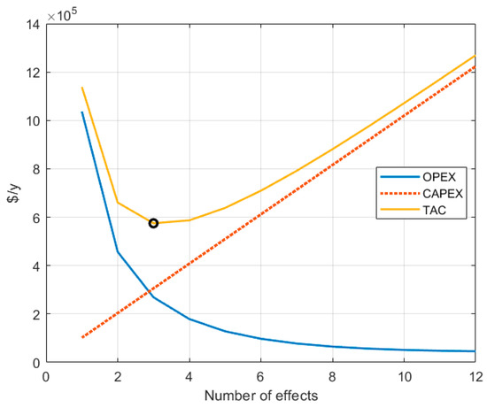 Figure 3 shows the trend of the two curves (in USD/year) as well as the total costs, obtained by the combination of the two, vs the number of effects ranging from 1 up to 12. The OPEX curve, representing the external duty requirement, has a hyperbolic trend while the CAPEX has a linear increase with respect to the number of units employed. The optimal number of effects is three and the corresponding total annualized cost is 574,882 USD/year.