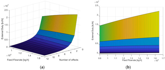 The operating costs were then averaged over the uncertain domain according to Equation (3). A new OPEX trend reflecting the uncertainty contribution was then obtained. As it can be noticed in Figure 4b, the external duty can be considered a linear function of the inlet feed flowrate (R2 = 0.9974). The results obtained with the use of the normal distribution to describe the uncertain variable deviation give, as expected, the same values as the nominal case in Figure 3 independently from the selected variance due to the function properties already discussed in Section 2.1. Thus, since trends overlap, they cannot be distinguished on the plot.