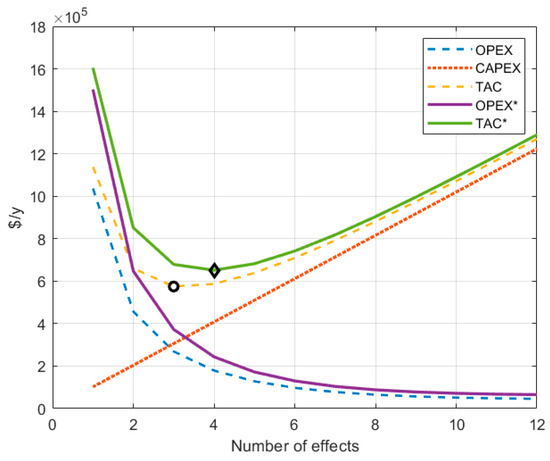As already introduced in Section 3.1, an increase in the number of consecutive evaporation stages, i.e., higher CAPEX, reflects in an OPEX decrease. Since the product is always the same given amount of concentrated solution (for this case study LN = L0·w0/wN = 1000 kg/h), maximizing the net income corresponds to minimizing the Total Annualized Costs (TAC).
