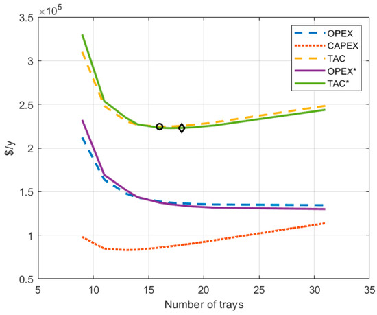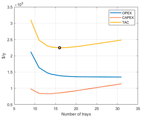 Results are reported in Figure 6. As usual, the operating costs show an asymptotic trend with an increasing number of stages. The reflux ratio indeed approaches the Rmin value as a higher number of stages is used. This lower reflux results in lower boilup and condenser duties, which explains the behavior of the OPEX curve.