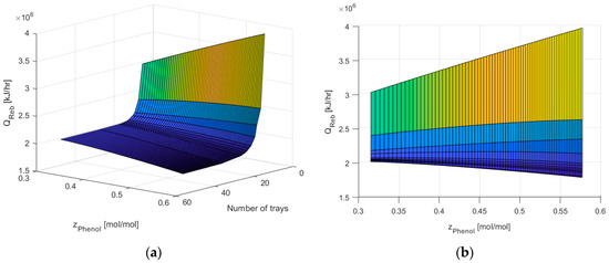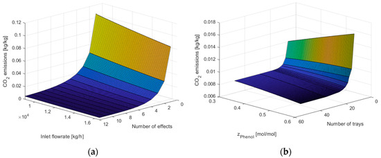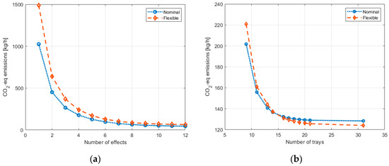 Even though CO2 emissions are strictly correlated to the fuel employed to produce the required energy, this study carried out a comparison between different configurations of the same unit. Therefore, the study can be considered fuel-independent. The results presented in this paper refer to natural gas. For the same reason, CO2 emissions related to feedstock and products cancel out when computing the difference between two configurations. According to several authors [59,60,61,62], taking into account the plant lifetime, the CO2 emissions associated with the installation of additional units/stages are negligible with respect to the emissions related to the heat requirement. By analogy, although the CO2 emissions due to pumping and cold duties were thoroughly calculated using a specific emissions factor of 51.1 kgCO2/GJ, as suggested by Waheed et al. [6], they resulted in orders of magnitude lower with respect to the steam duty, as already proven by several studies [6,60,61,62].