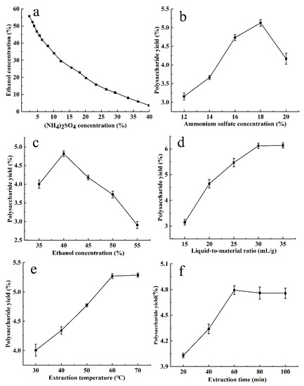 Figure 1b exhibits the effect of the ammonium sulfate concentration on the yield of CCSPs. The other parameters were fixed as follows: an extraction time of 60 min, an extraction temperature of 50 °C, an ethanol concentration of 40%, and a liquid-to-material ratio of 20 mL/g. The CCSPs yield increased with an increase in ammonium sulfate concentration below 18% and decreased when the ammonium sulfate concentration was higher than 18%. When the ammonium sulfate concentration increased, the CCSP yield first increased and then decreased, which may be due to the synergistic effect of the partition coefficient and phase ratio. As the ammonium sulfate concentration increased, the volume of the lower phase increased, so more CCSPs were distributed to the lower phase. When the ammonium sulfate concentration was too high, the salting-out effect was enhanced; thus, the CCSPs yield decreased. In addition, it would cause a waste of ammonium sulfate and increase production costs. The ammonium sulfate concentration of 18% was initially selected as the optimal parameter for further experiments.