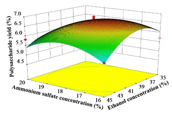 The response surface can intuitively reflect the impact of the interactive effect of the two factors on the yield of the target product. The steeper the slope of the response surface, the greater the impact of the interactive effect on the yield of CCSPs. As can be seen from Table 3, the interactive effect of the ammonium sulfate concentration and ethanol concentration had a significant influence on the yield of CCSPs; thus, only this interactive effect was analyzed. Figure 2 shows the interactive effect of the ammonium sulfate concentration and ethanol concentration on the yield of CCSPs when the other variables were maintained at zero level. The yield of CCSPs increased when the ammonium sulfate concentration increased from 16% to 18%, while the CCSPs yield tended to decrease with an increase in the ammonium sulfate concentration beyond 18%. Meanwhile, the yield of CCSPs also increased with an increase in the ethanol concentration from 35% to 40%, and the CCSPs yield decreased when the ethanol concentration was greater than 40%. The maximum yield of CCSPs was obtained when the ammonium sulfate concentration and ethanol concentration were selected as about 18% and 40%, respectively.